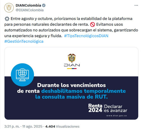 Es importante aclarar que entre agosto y octubre de 2025, la consulta de estado del RUT no estará disponible por disposición de la DIAN.